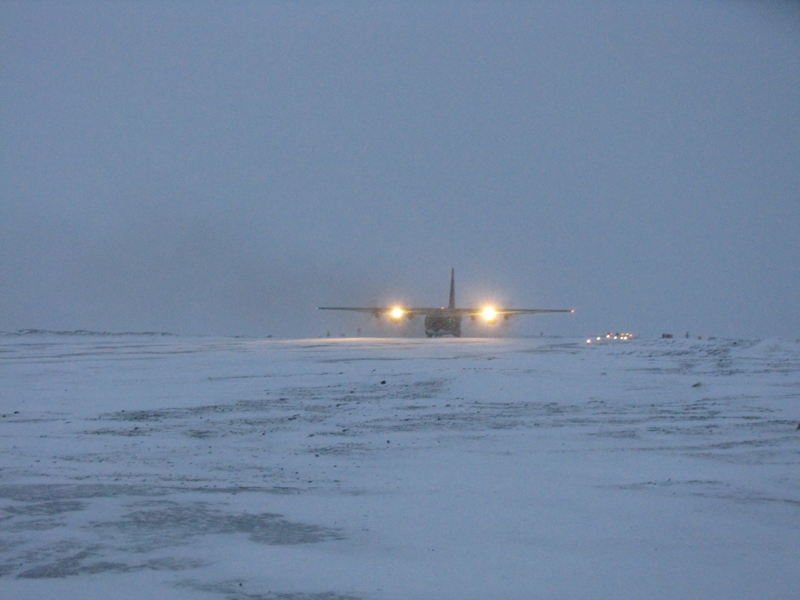 Hércules C-130 tocando pista de Marambio en pleno vuelo del Puente Aéreo Logístico